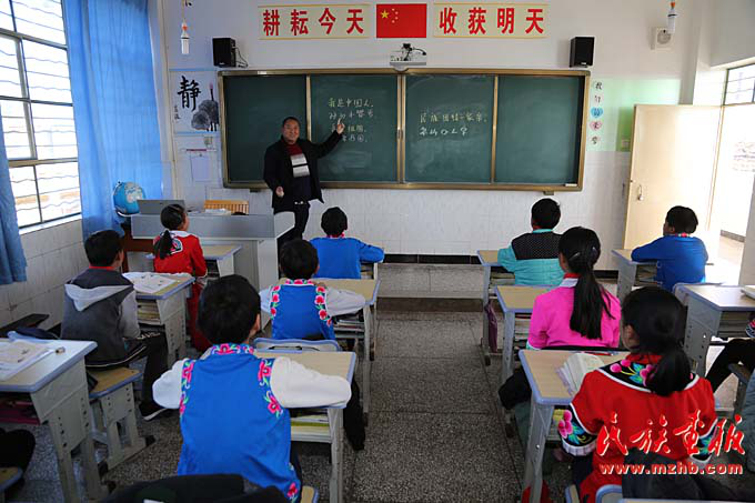 腊湾民族小学是牟定县海拔最高的小学,这里环境艰苦,但是来这里的老师都坚持了下来。明艳红老师2011年从楚雄师范学院毕业后,来到了腊湾民族小学。6年时间弹指一挥,她没有被艰苦闭塞的环境吓倒,反而更加热爱这份工作。现在,她带五年级数学课。她说:“在国家对民族教育的大力支持下,腊湾民族小学的办学条件有了很大改善,给我们老师盖了单身宿舍,现在吃的、住的都很好。我们的工资还比县里条件好的学校高出1000多元。”在采访中我们得知,李有顺老师原来是腊湾民族小学的老校长,作为本地人,他在腊湾民族小学工作快30年了,校长就干了17年。他说:“现在岁数大了,精力不够充沛了,校长得让年轻人干,这样才能保持办学有创新。”李有顺把校长一职传递给了30多岁的李发庭。去年刚刚接过“接力棒”的李发庭表示:“压力很大,但一定不能辜负乡亲们和老校长的期望。”