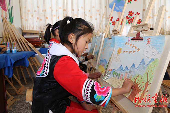 腊湾民族小学二年级的学生在上美术课