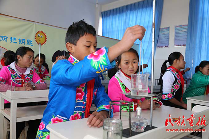 腊湾民族小学四年级的学生在上实验课
