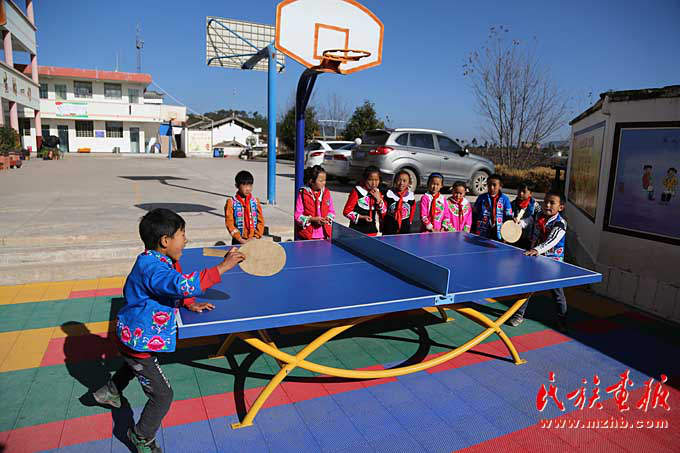 课间休息,腊湾民族小学学生在打乒乓球
