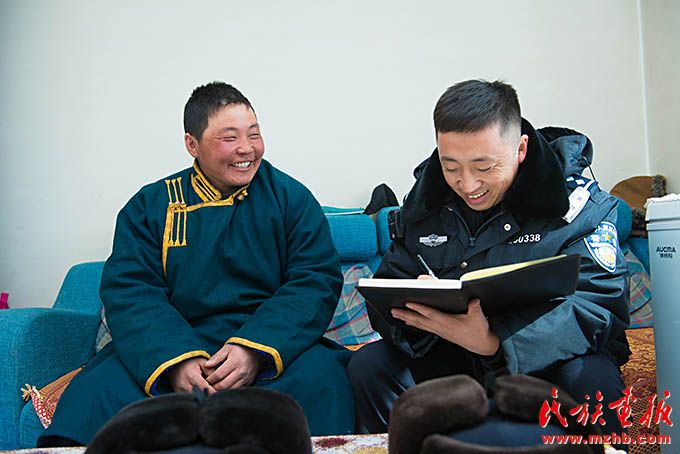 “想边民之所想,急边民之所急,首先要知道他们想什么,急什么,这些要靠走访。”这是敖日奇朗常挂在嘴边的话。新宝力格边防派出所辖区面积880平方公里,常住人口有980户2500 人,敖日奇朗在这里工作期间还担任了贡诺尔嘎查责任区民警。现在,他是诺门罕布日德边防派出所副所长,同时担任着诺门罕布日德嘎查责任区民警。诺门罕布日德边防派出所辖区面积1010平方公里,常住人口有426户896人,边境线总长为50公里。“在诺门罕布日德边境派出所辖区,户与户之间距离至少有2公里,离派出所最远的牧户在70公里外。我们坚持每年入户走访全覆盖不少于两次,每年的5至10月,牧民们都会搬到夏营地集中放牧。我们的蒙古包流动警务室也会跟随牧户到夏营地维持治安。”敖日奇朗这样介绍如今的走访和治安工作。