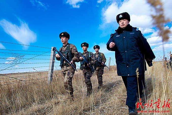 诺门罕布日德边防派出所副所长敖日奇朗(右一)带领民警与解放军边防连队联合巡逻。