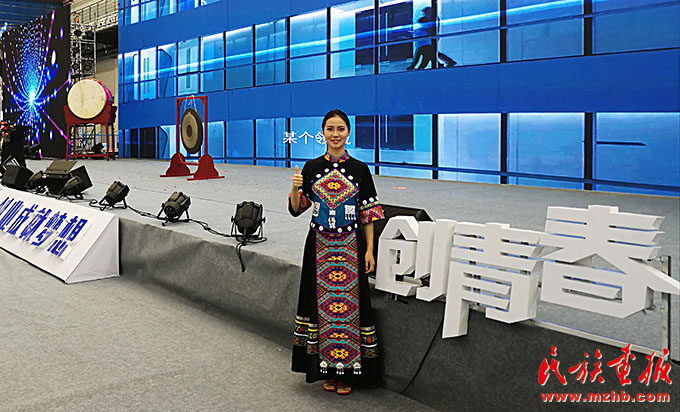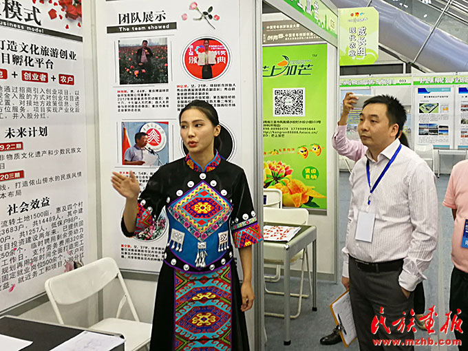 钟亿灵在“创青春”中国青年创新创业大赛中为嘉宾做项目讲解。