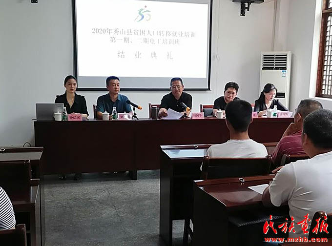 2020年6月29日,钟亿灵(左一)出席在清溪场镇武陵山致富带头人实训基地举行的秀山县2020年贫困人口转移就业培训第一、二期电工培训班结业典礼。(秀山县人民政府网)