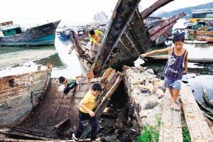三亚渔港社区疍家人的孩子在沉船遗址玩耍(2007年摄)。