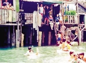 三亚疍家人昔日赖以生存的“疍家棚”,全家老小吃住都在一个棚里。孩子们戏水游玩就在疍家棚前,热闹非凡(1997年摄)。
