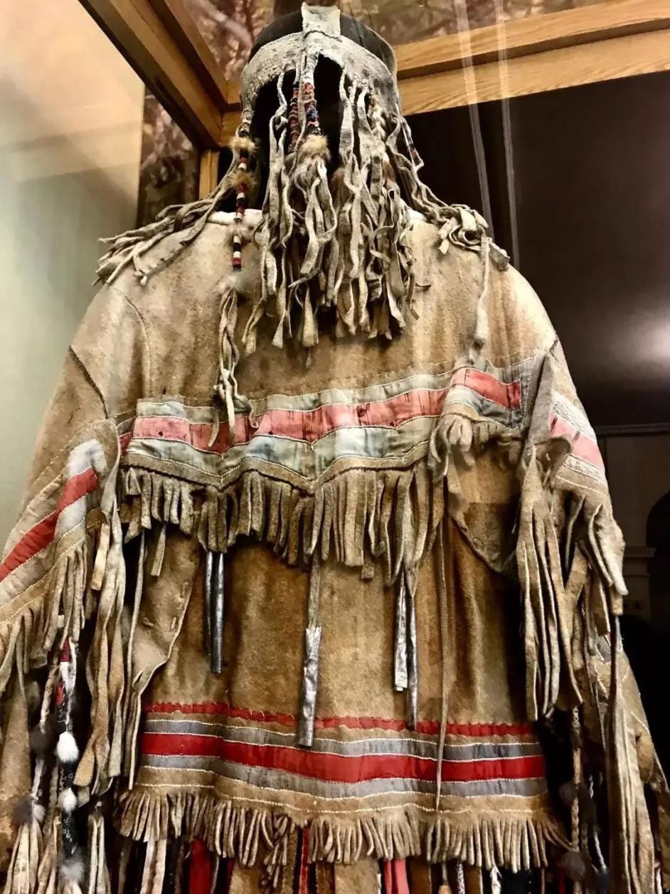 展区内还陈列着几套保存完整的萨满服饰,有鹿皮、兽皮、鱼皮和纤维等多种材料。与国内留存的萨满服饰不同的是其鹿角帽的制作,鹿角帽上装饰着龟、蛇和神偶形象,顶端八岔鹿角的材料是金属。