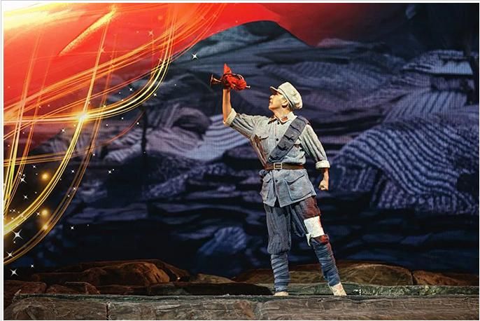 《花儿与号手》是一部以红军长征路过六盘山为背景创作的音乐剧,全剧展现了长征路上红军战士的理想信念和“长征是宣言书、是宣传队、是播种机”这一核心思想,弘扬了中国共产党百年征程中展现出的无私无畏的革命精神。