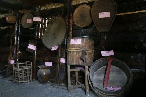 “农耕文化陈列馆”是由两栋传统的木质民房改建,从大门进来,门的两边放置有农具,右侧一个是存储粮食的仓库,沿着仓库边上的石阶往上走,从小门进去,大大小小的簸箕、饭甑、猫箩、鱼箩等农具应有尽有。
