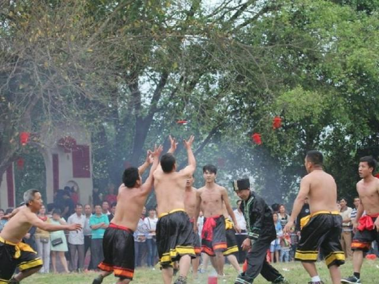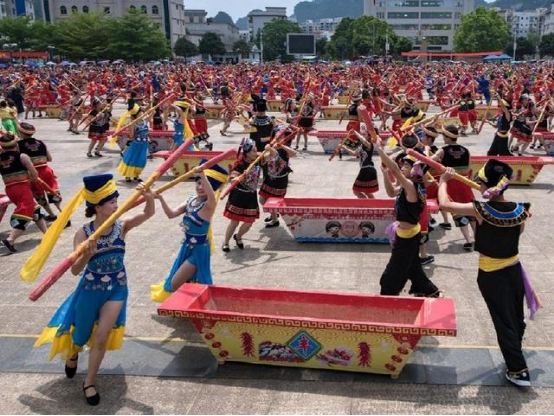 打榔舞,是崇左市天等县的壮族传统民俗舞蹈,用于酬神、还愿、祭祀、娱乐等活动,起源于唐代武德年间。打榔舞主要道具为木榔,音乐响起后,每人用一米多长的木杵有节奏的敲击榔壁、榔底和榔边,动作欢快有力,以此来表达壮族人民对五谷丰登、六畜兴旺、幸福吉祥的祈求和渴望。表演者不分男女老少,有二人对打、四人对打、多人交错对打等多种方式。