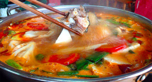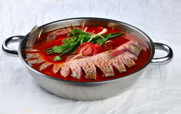 一、用鱼酱烹调的酸汤鱼在永乐当地是相当盛行的;因为烹调佳品鱼酱在永乐当地相当普遍,用它烹调出来的酸汤鱼的味道是麻、辣、酸、鲜五味俱全,也是苗乡一道有名的火锅。