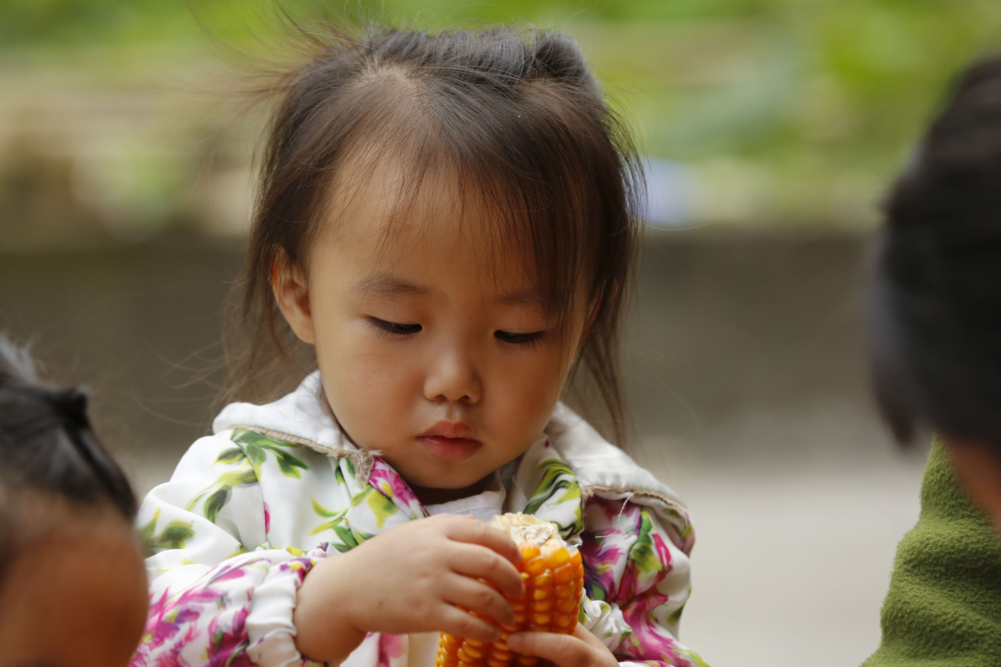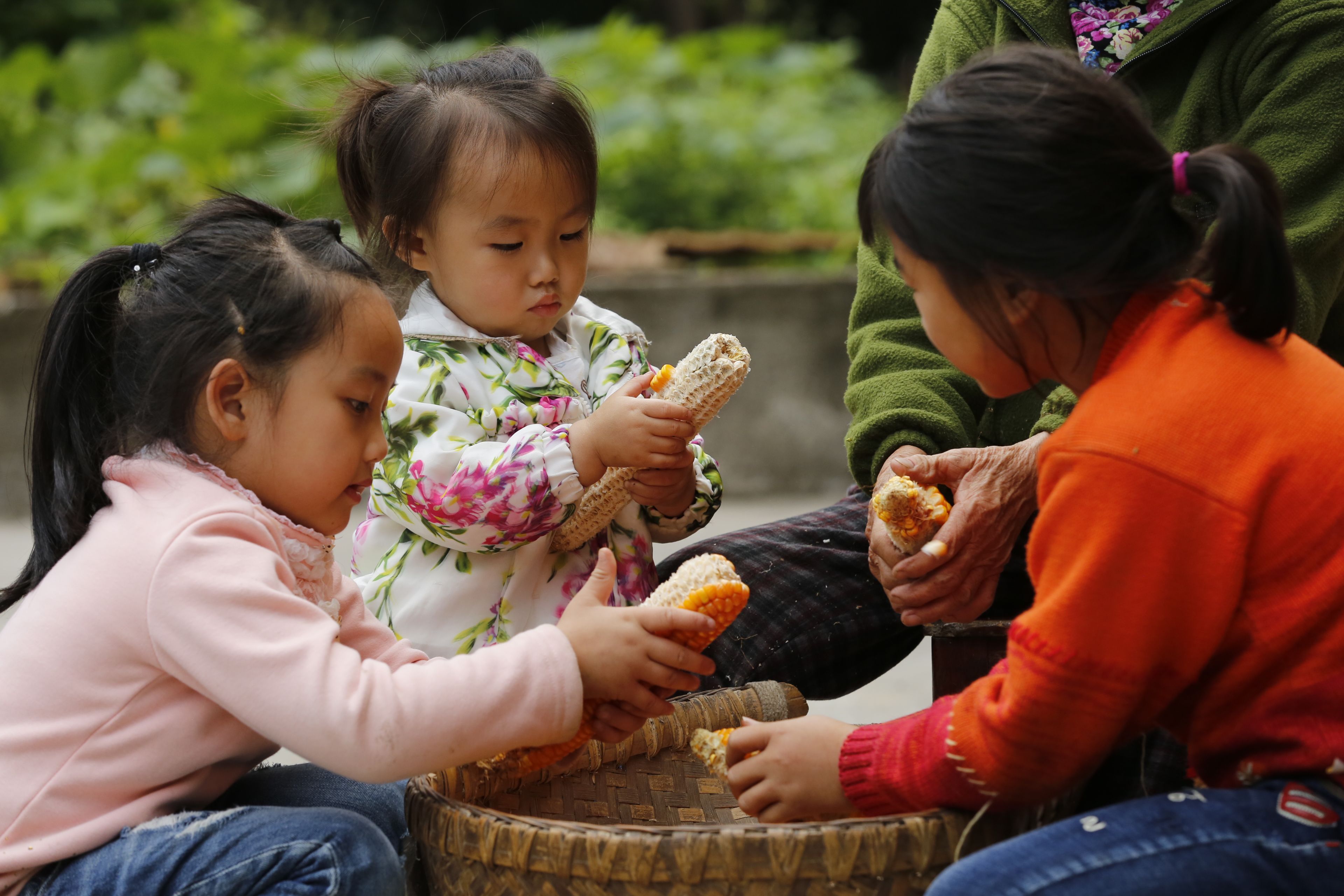 贵州贵阳苗族日常生活-老年人与儿童剥玉米